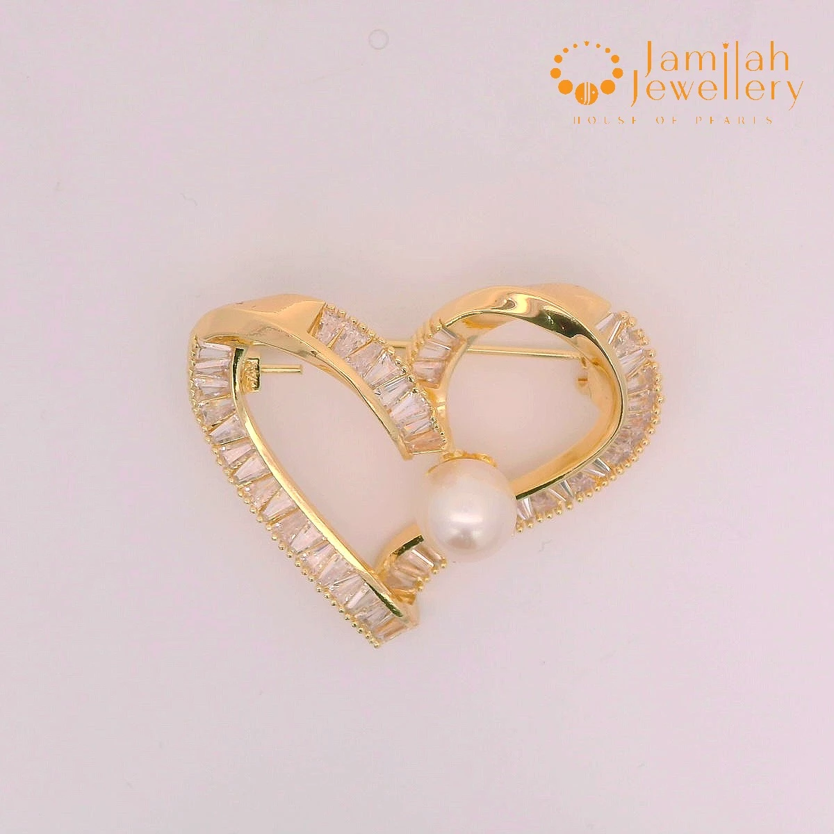 This heart shaped brooch features a lustrous, round cabochon cut pearl set in yellow gold. The romantic design is perfect for adding a touch of elegance to any outfit. Its warm, precious metal composi...  Read More