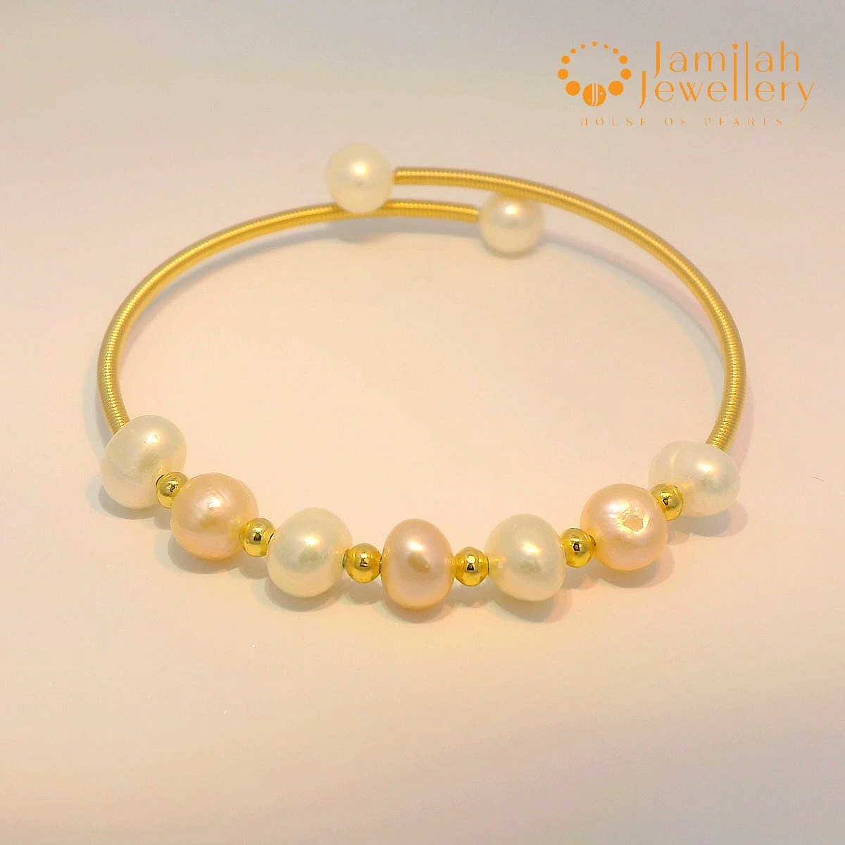 Designed for those who love simplicity with style, this white and peach pearl bangle combines the gentle glow of pearls with a sleek gold copper wire finish. Its minimalist aesthetic allows it to comp...  Read More