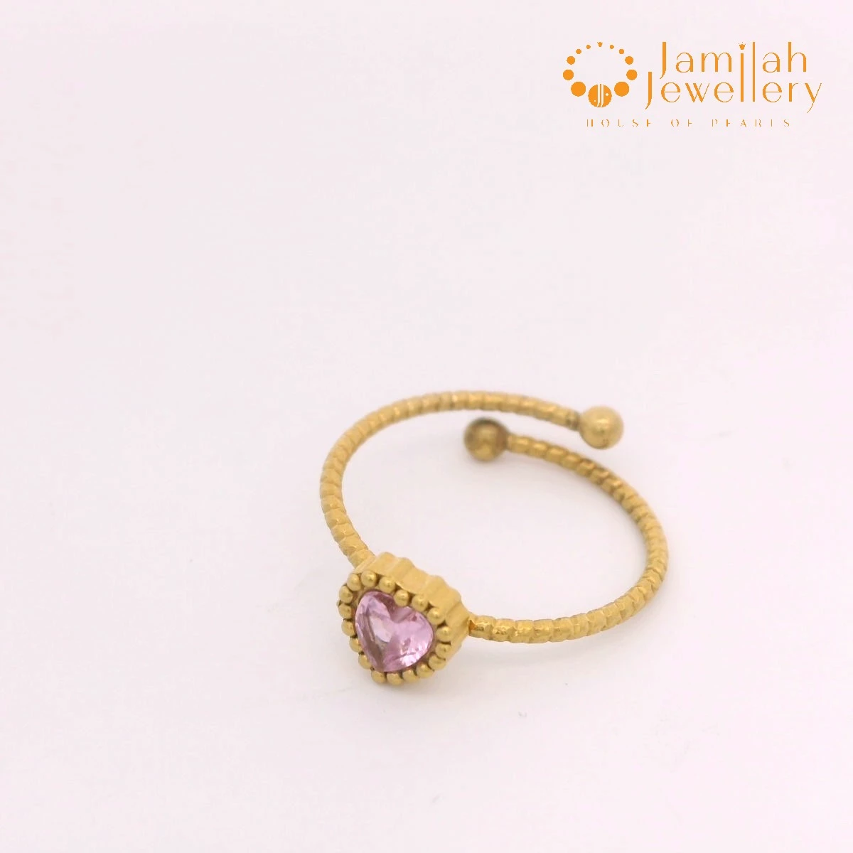 Yellow Gold Band Ring with Cubic Zirconia Heart Shaped Rose Quartz