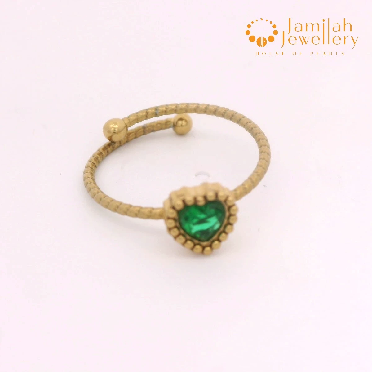 Dainty Stainless Steel Emerald Cubic Zirconia Heart Adjustable Ring