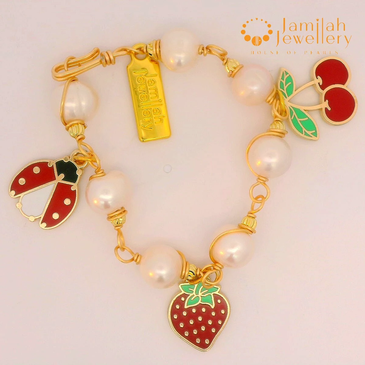 Add some sparkle to your day with this super fun bracelet! It has shiny round pearl beads and little gold wires that make it extra special. Cute strawberry, cherry, and ladybug charms hang from it — t...  Read More