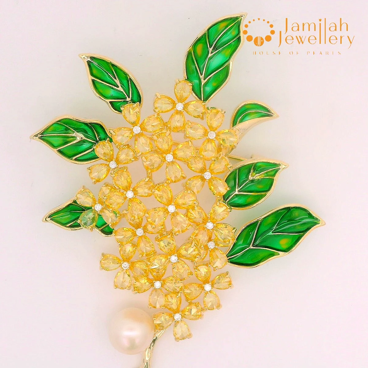 Exquisite floral brooch showcasing a cluster of yellow gemstones, accented with verdant leaves and culminating in a lustrous round cabochon pearl. Crafted with intricate detail and presented on other ...  Read More