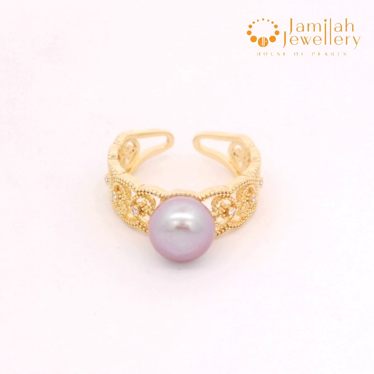 Elevate your ensemble with this exquisite yellow gold cocktail ring. The ring showcases a lustrous, round, purple pearl with a smooth cabochon cut. The shank is delicately crafted with intricate detai...  Read More