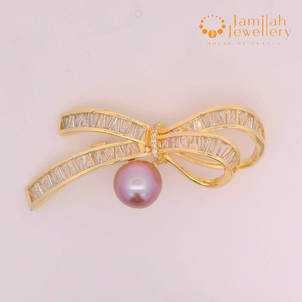Exquisite yellow gold brooch showcasing a luminous, round cabochon-cut pearl. The pearl, featuring a captivating reddish purple hue, adds a touch of sophistication to this timeless piece. Crafted with...  Read More