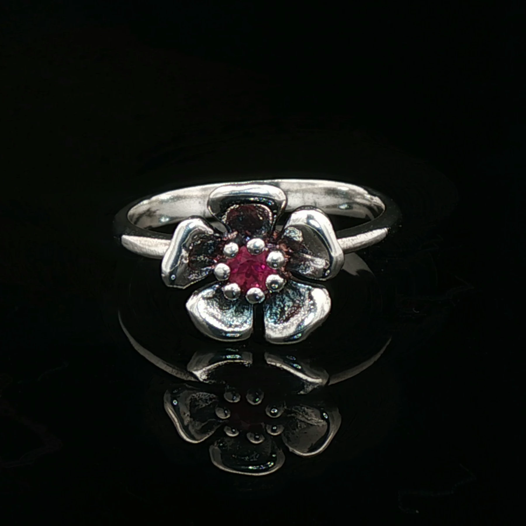 Elevate your style with this charming sterling silver cocktail ring set with a ruby. The floral design adds a touch of elegance and sophistication, making it a perfect accessory for any occasion. Craf... Read More