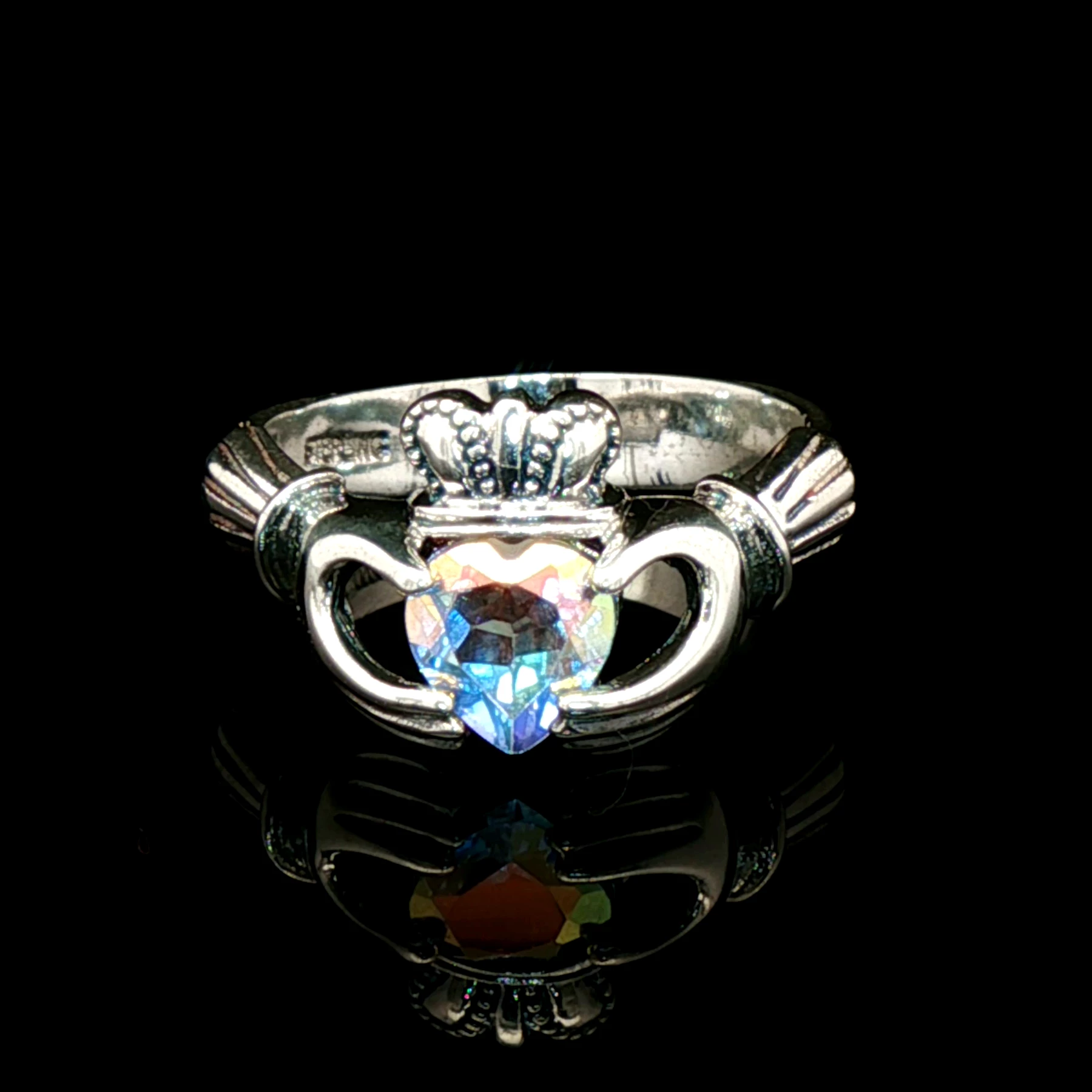 This sterling silver Claddagh ring features a heart-shaped crystal at its center. With its crown, heart, and hands design, this timeless piece symbolizes love, loyalty, and friendship. This ring has a... Read More