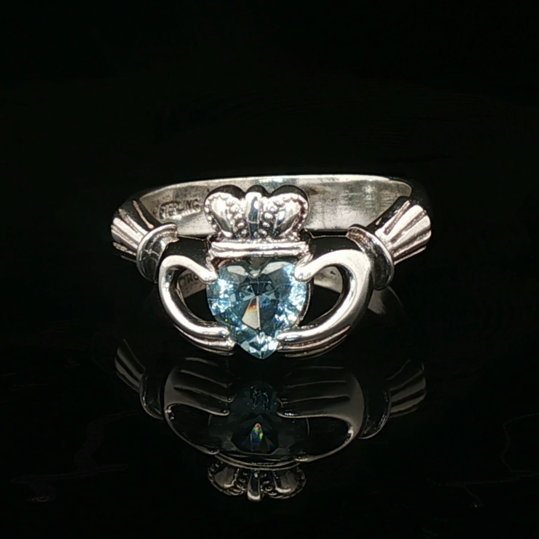 Sterling Silver Claddagh Ring with Heart-Shaped March CZ, size 7.25