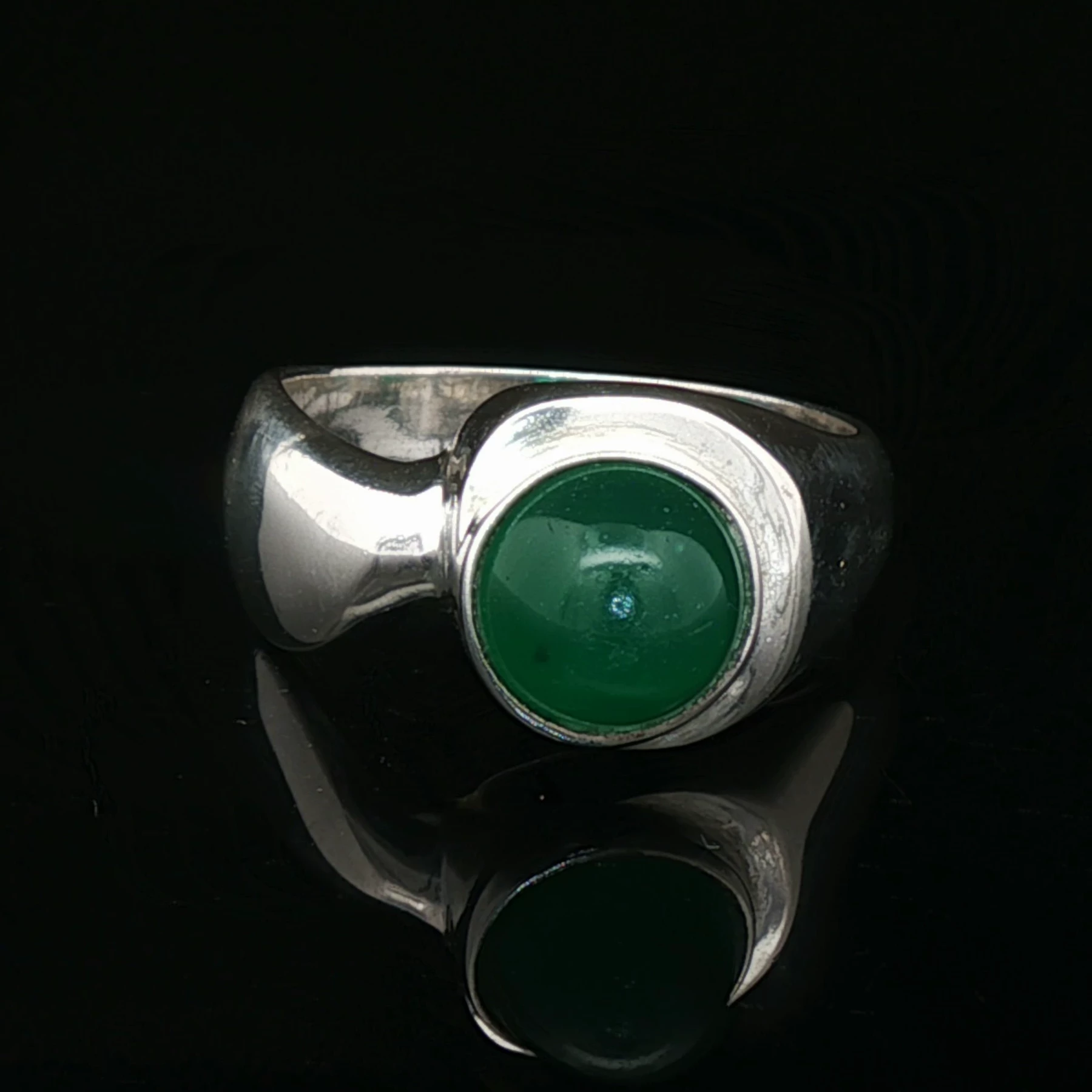 Elevate your style with this handcrafted sterling silver ring with a luminous, cabochon-cut green onyx centrepiece adds an element of refined elegance. Its dome like surface reflects light with subtl... Read More