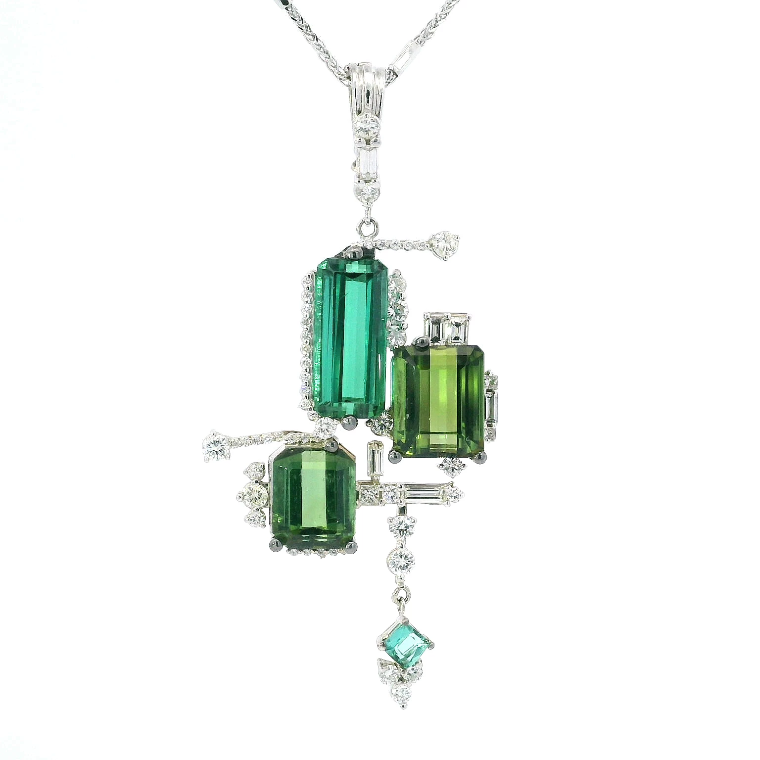 Elevate your style with this exquisite 18K white gold pendant, featuring a cluster of step-cut emerald shape tourmalines in varying shades of green. This vertically suspended pendant showcases a trans...