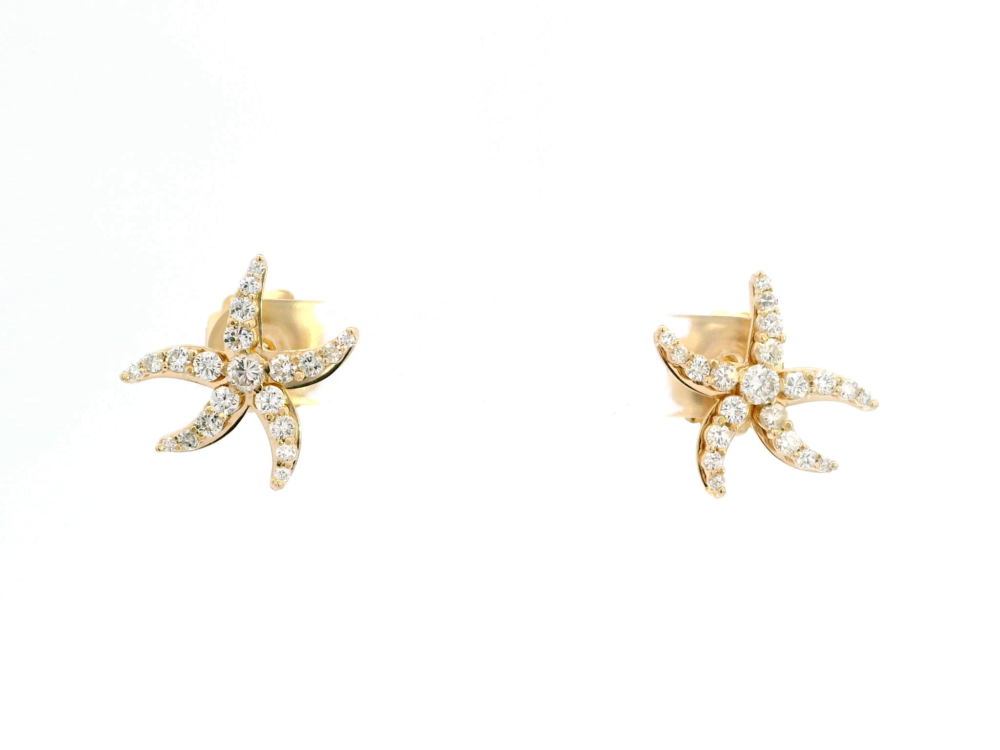 Embrace seaside elegance with these charming stud earrings, crafted in lustrous 14K yellow gold. Each earring showcases a delicate starfish design adorned with round cut diamonds exhibiting brilliant ...