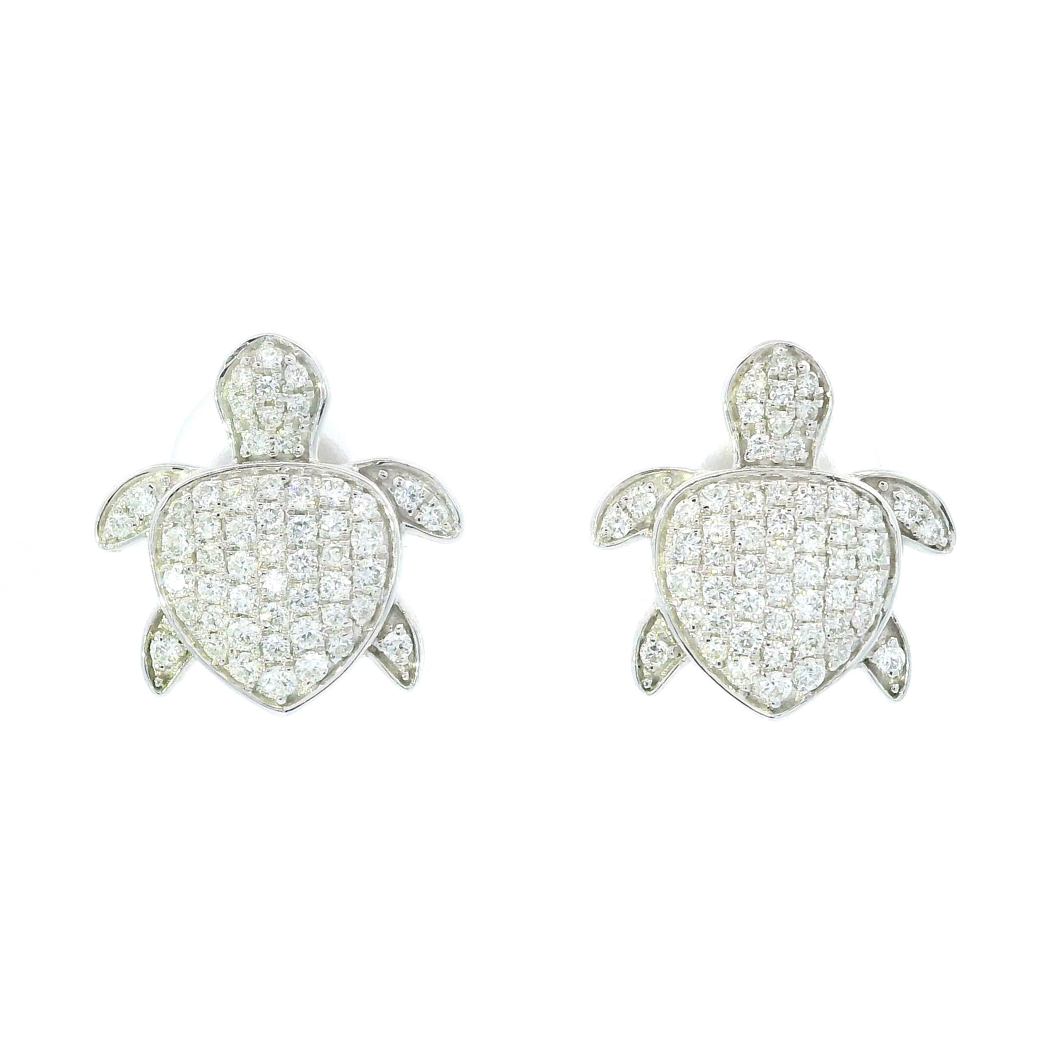 These cute pair of turtle shaped earrings are crafted from 14K white gold. The surface of each earring is adorned with a cluster of beautiful white round diamonds exhibiting a high degree of brillianc...