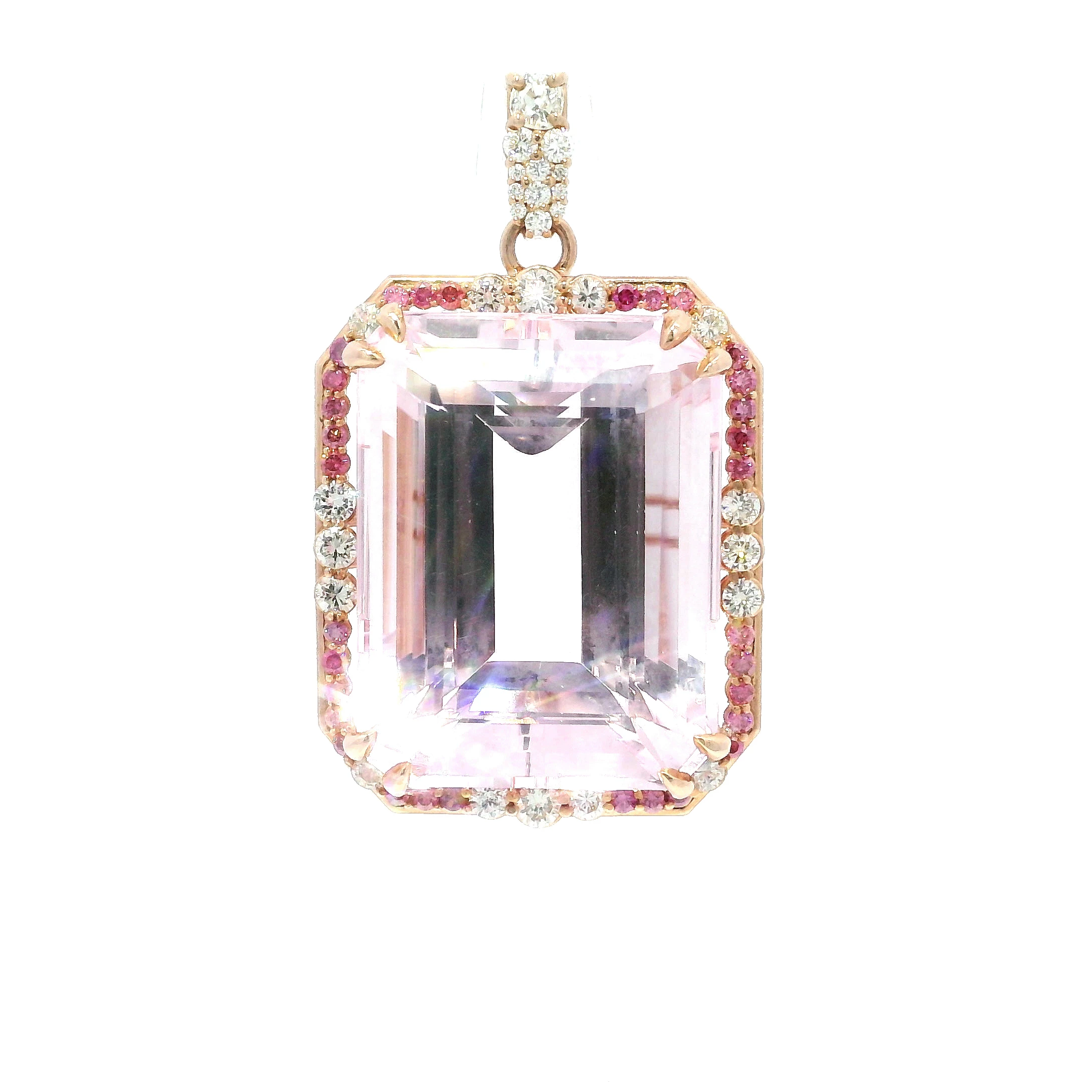 This magnificent pendant features 72 cts of pink beryl called Morganite (also called pink emerald.) Surrounding this pendant are 1.16 cts of SI1 clarity white diamonds and .39 cts of fancy pink diamon...