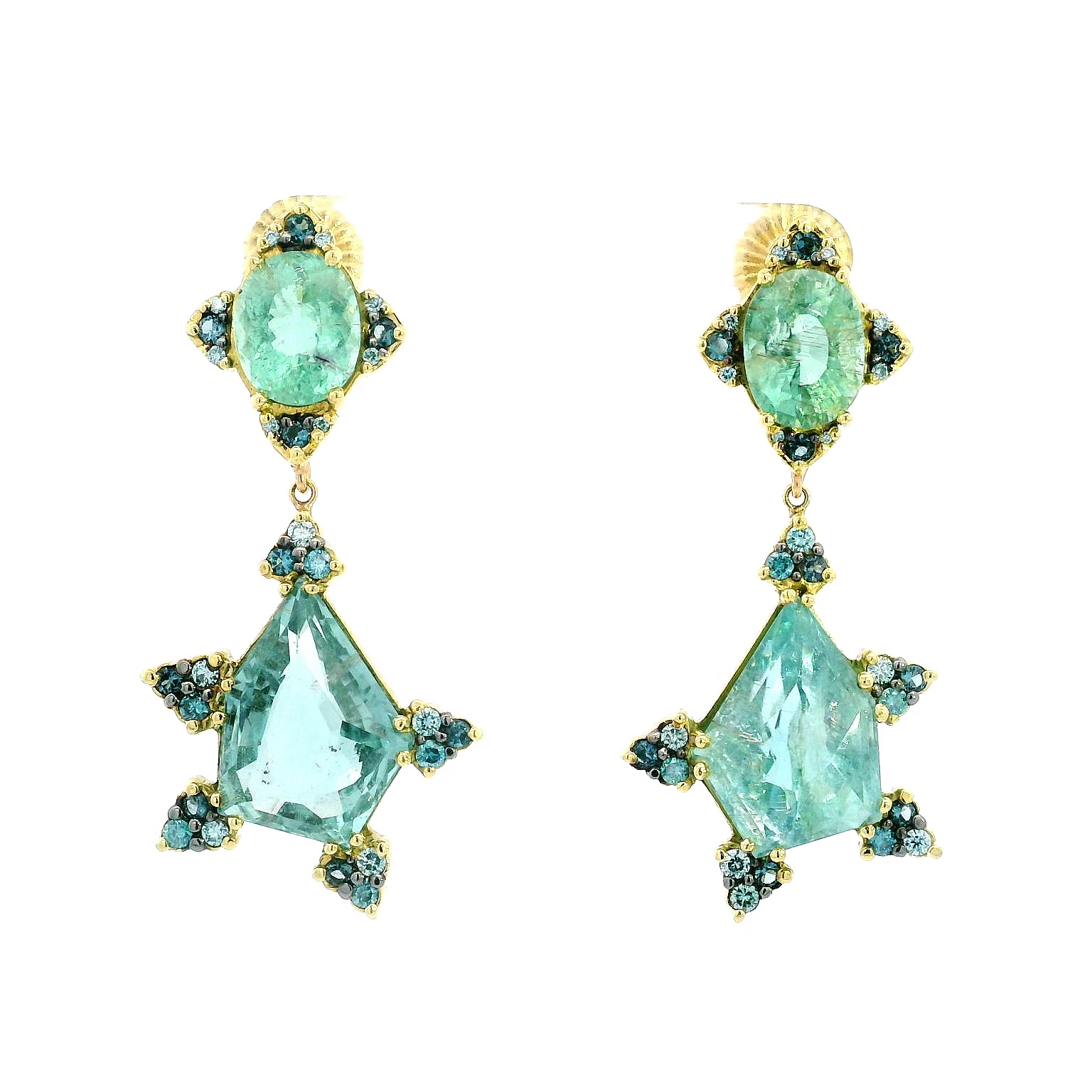Elevate your style with these captivating dangle earrings. Crafted in radiant 18K yellow gold, they showcase mesmerizing paraiba tourmalines. Their transparent, bluish-green hue exudes elegance and ch...