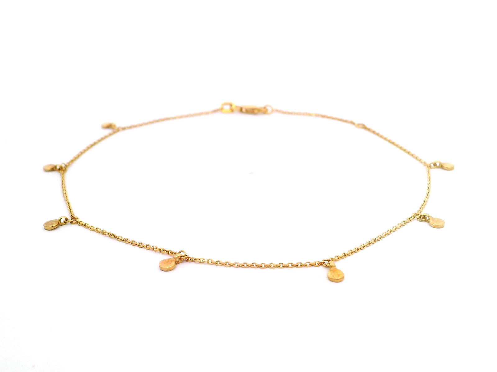 Embrace minimalist elegance with this delicate 14K yellow gold anklet. This piece is punctuated with evenly spaced small, flat disks that add a touch of subtle movement and light catching detail. A ti... Read More