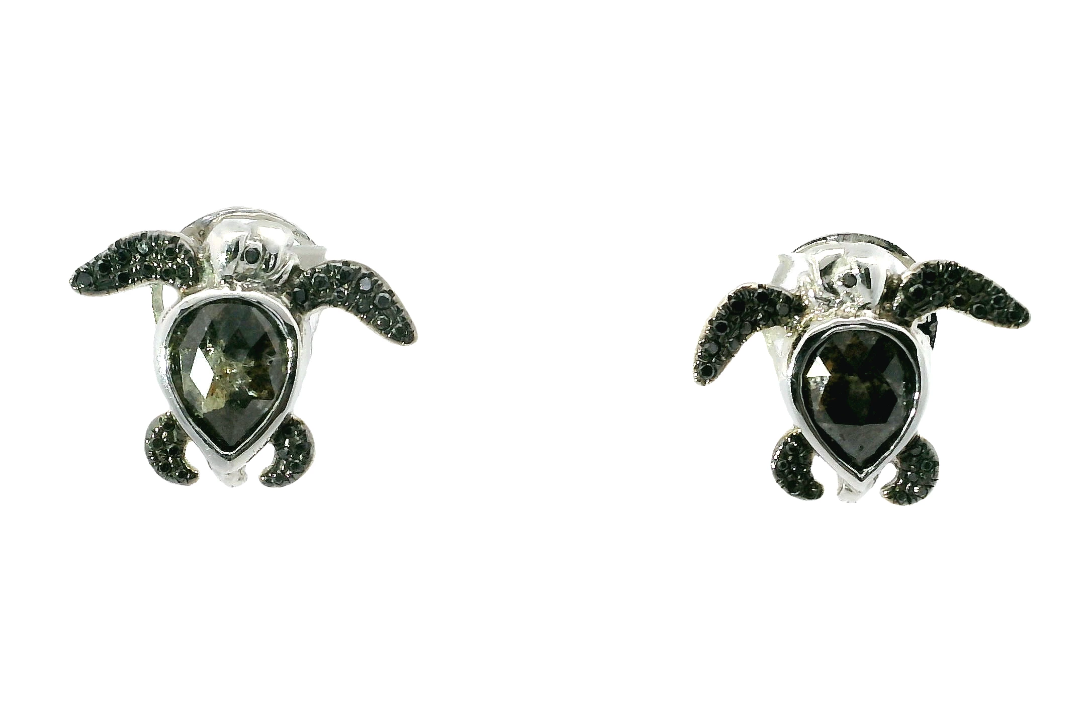 These stunning sea turtle hatchling studs feature two central pear shaped black diamonds exhibiting a faceted cut with a transparent to translucent quality. This limited edition creation was crafted b...