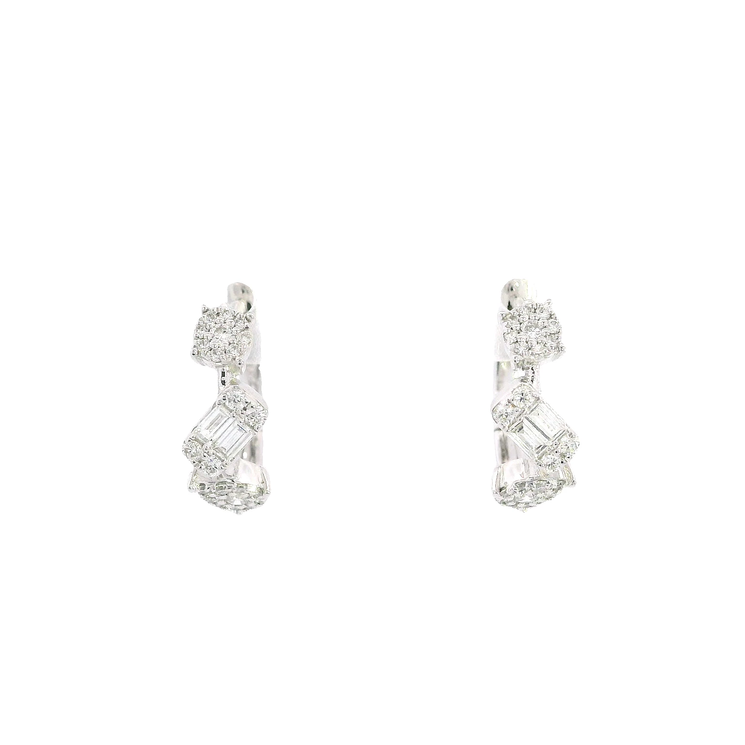 Elevate your style with these exquisite huggy earrings, crafted in 14K white gold. These earrings showcase an array of different cut diamonds meticulously set to create a dazzling display of light and...