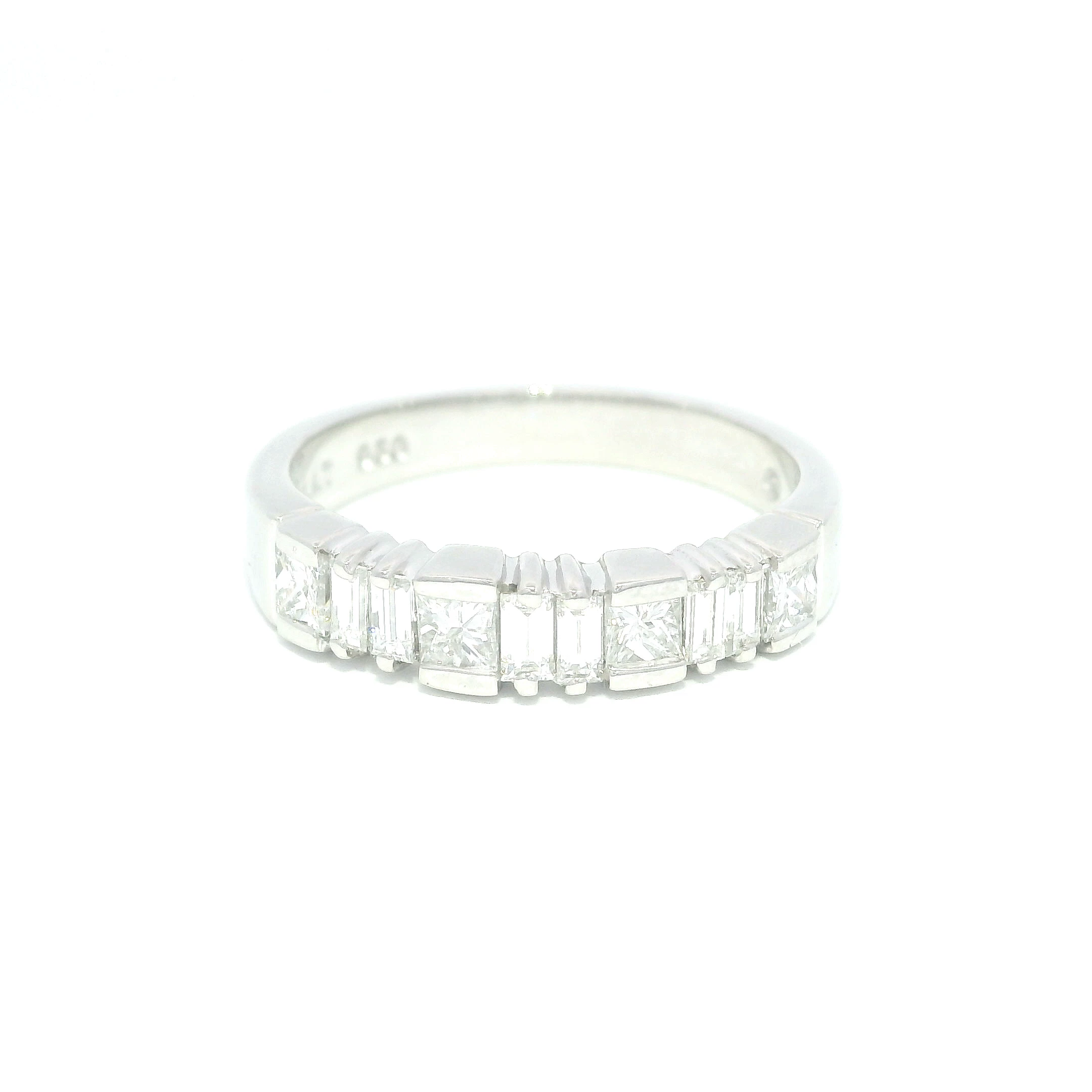 This platinum ring was designed with VS2 clarity H color diamonds. This ring creates a play of sparkle by its interspaced baguette and princess cut diamonds making it a fabulous fashion ring for any o...