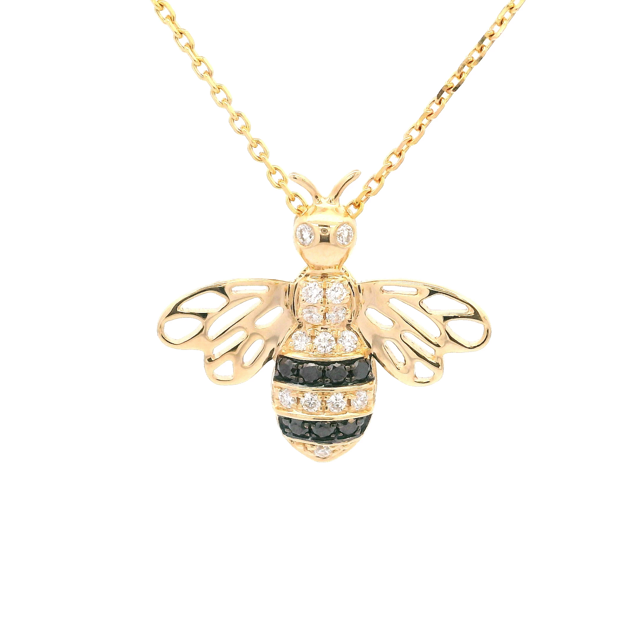 This delightful 14K yellow gold bee pendant is a perfect blend of elegance and whimsy. Crafted with .20 cts of white and black diamonds, its high polish wings catch the light beautifully. Ideal for na...