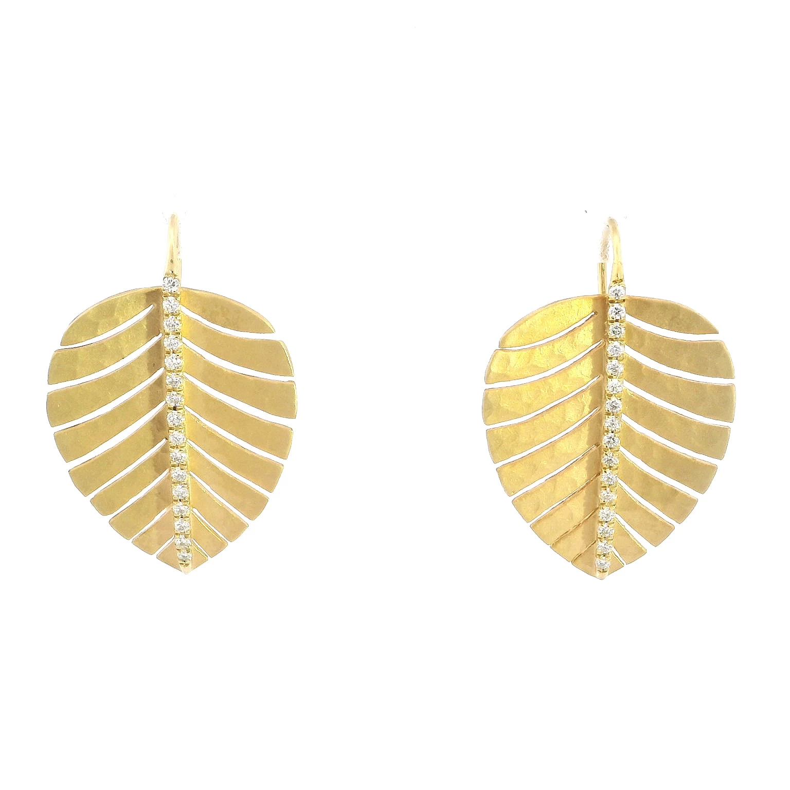 Elevate your style with these hammered earrings. Crafted in radiant 14K yellow gold, they feature a unique leaf design adorned with brilliant round cut diamonds adding a touch of sparkle and sophistic...
