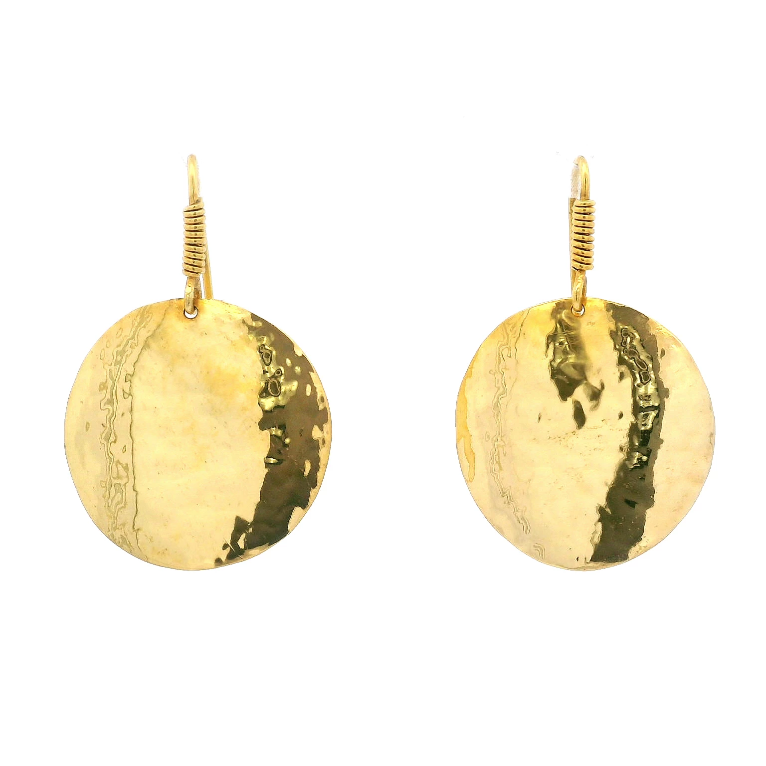 Elevate your style with these radiant 18K yellow gold disks earrings. This piece features a classic hook design with a beautifully hammered round disk design. These earrings are a perfect addition to ...