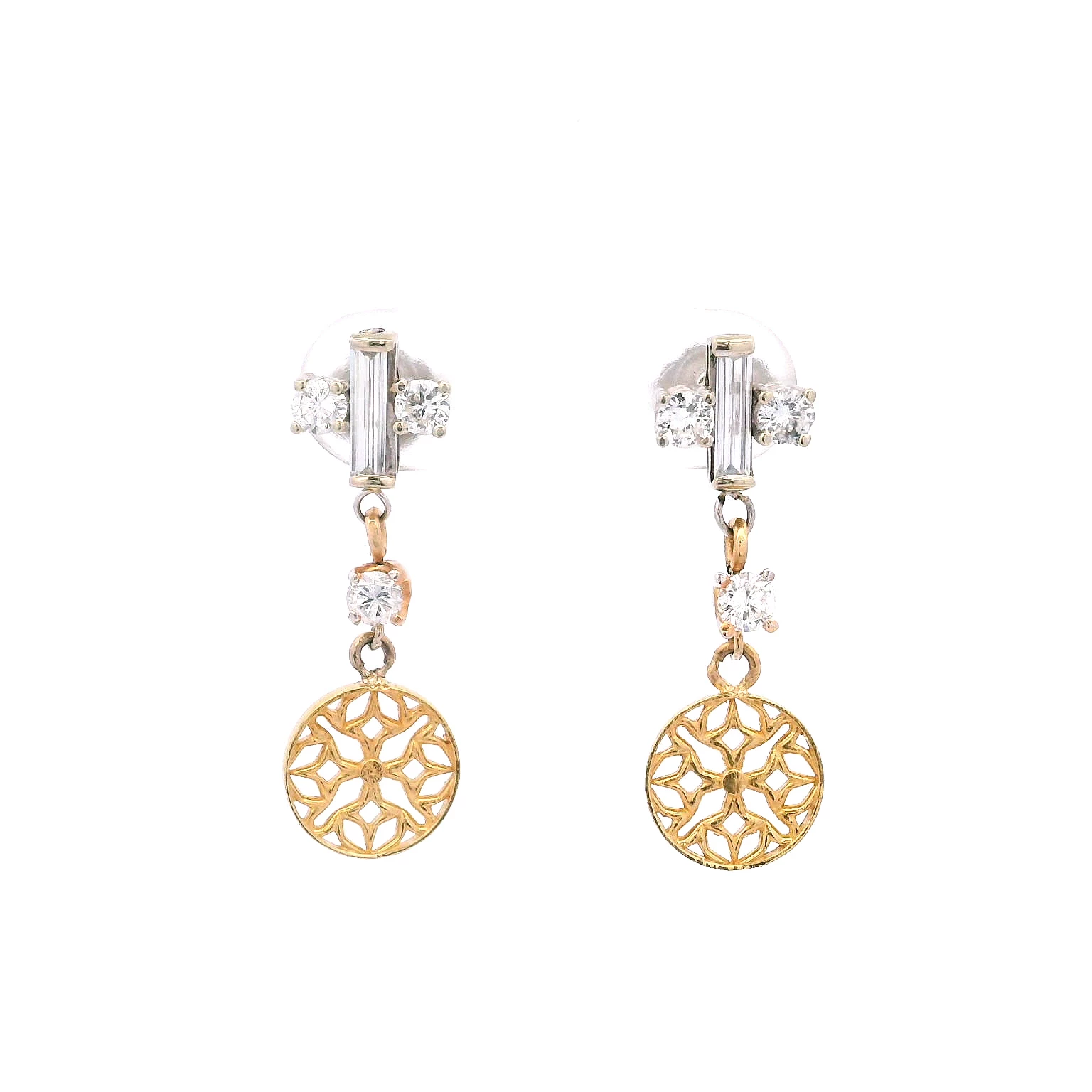These unique dangle earrings feature round and baguette cut diamonds set in luminous 18K yellow and white gold. These earrings are designed with an intricate openwork pattern that adds a touch of mode...