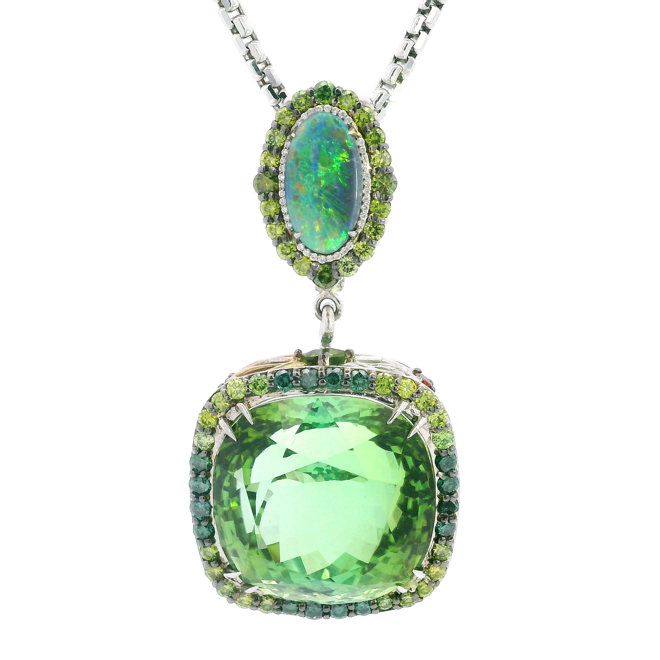 This striking pendant features a vibrant green, cushion cut tourmaline set in lustrous 18K white gold. This stone boasts a brilliant cutting style, enhancing its natural brilliance and showcasing its ...