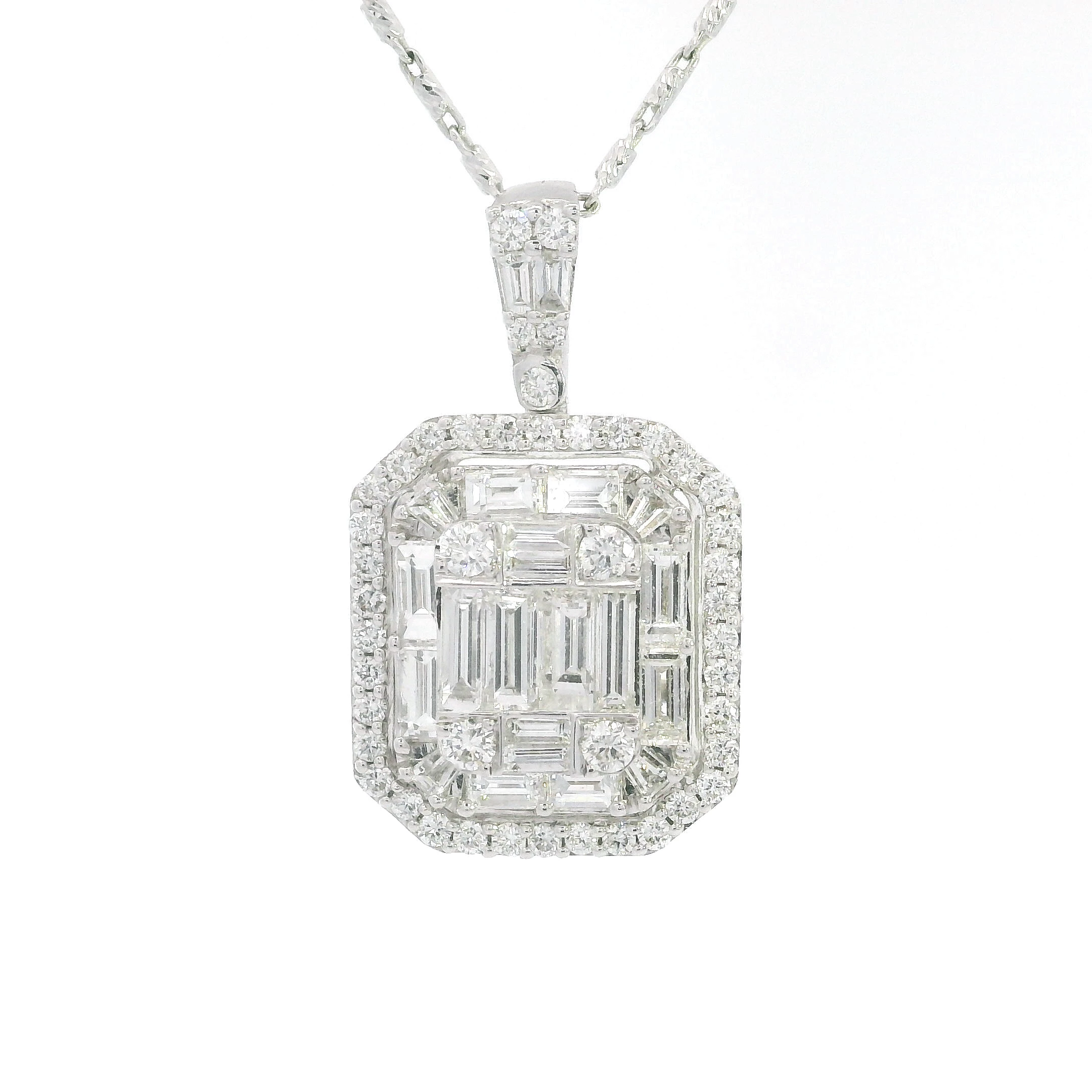 This stunning 18K white gold pendant is a true statement piece. Crafted with precision, it features a dazzling array of 1.60 cts of VS1 clarity F-G colored diamonds that catch the light beautifully, m...