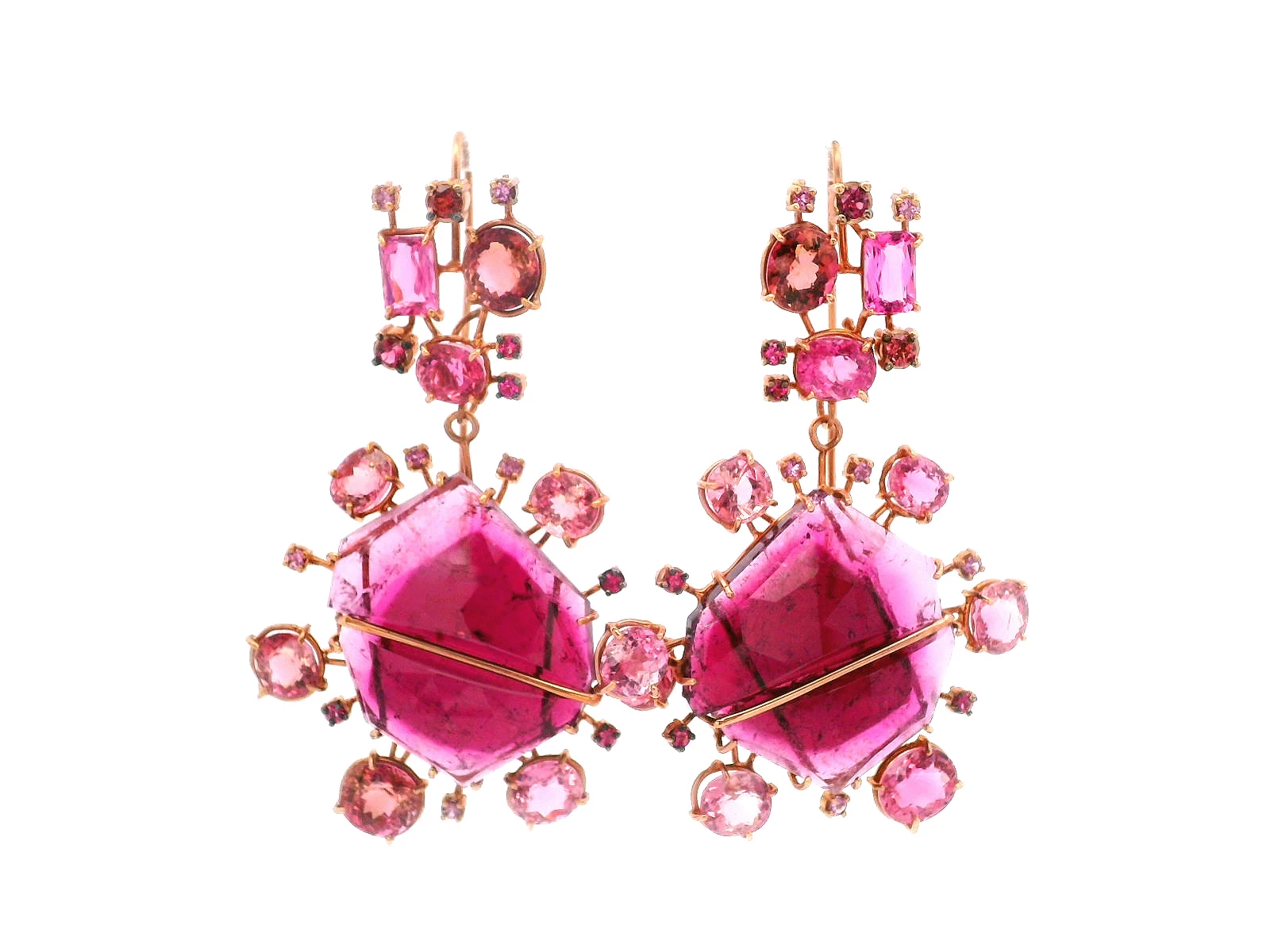 Embrace creative allure with these rose gold dangle earrings. Showcasing octagonal cut tourmalines with a reddish pink hue, these earrings offer a translucent glow. Their unique charm is heightened by...