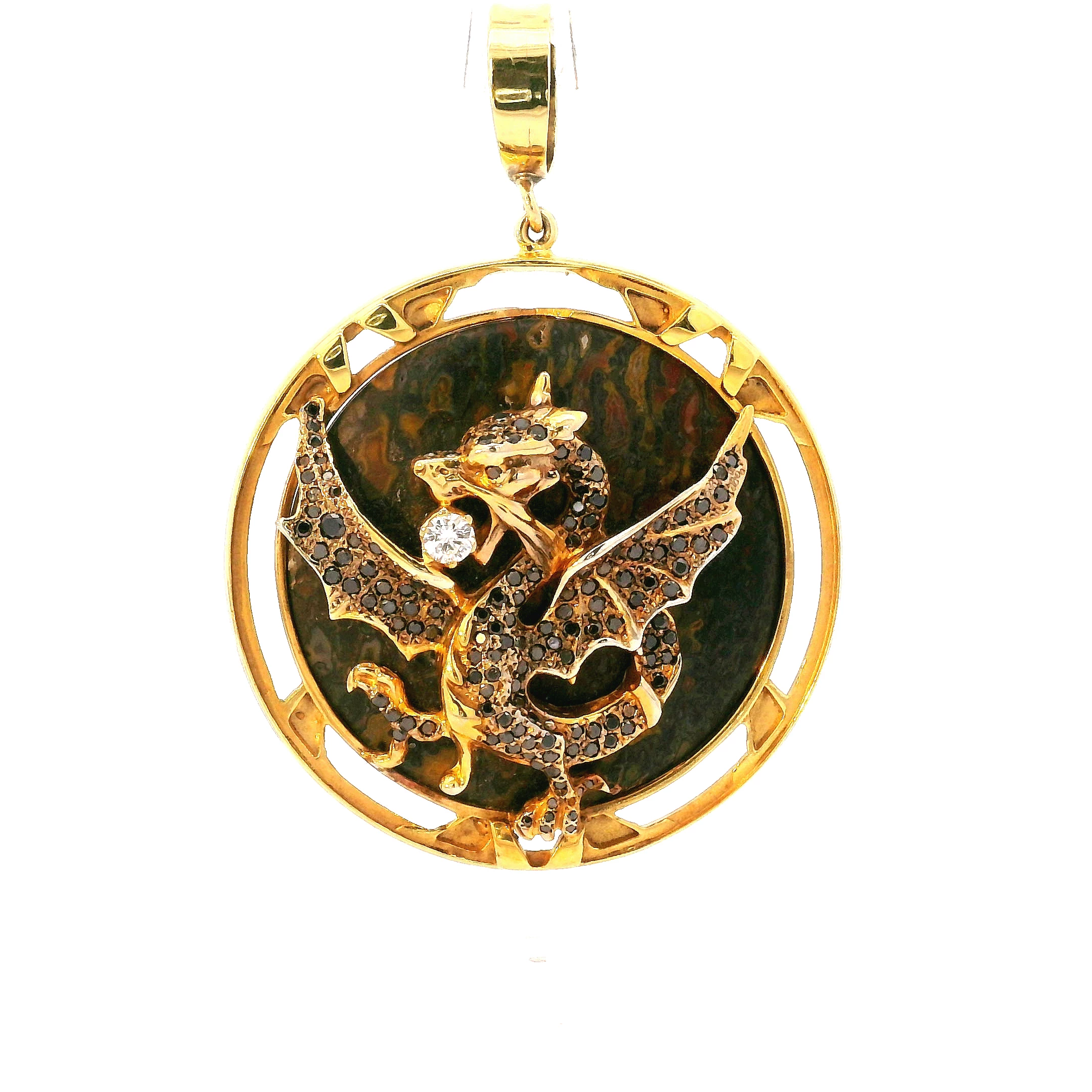 This stunning dragon pendant captures the essence of mythical elegance. Crafted with intricate details, it features a fierce dragon design embellished with 130 black diamonds, and a VS2 G color diamon... Read More