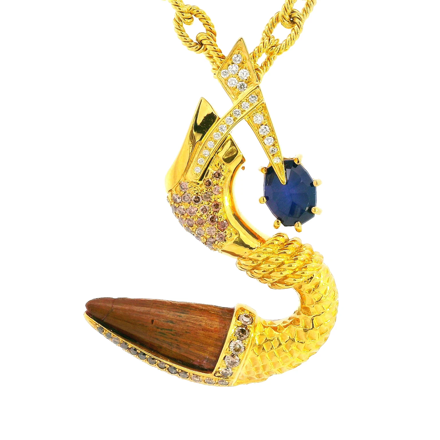 Indulge in the prehistoric allure of this 18K yellow gold pendant showcasing a Spinosaurus tooth set in a unique spur shaped design. A striking oval cut sapphire adds a touch of artistic flair. Design...