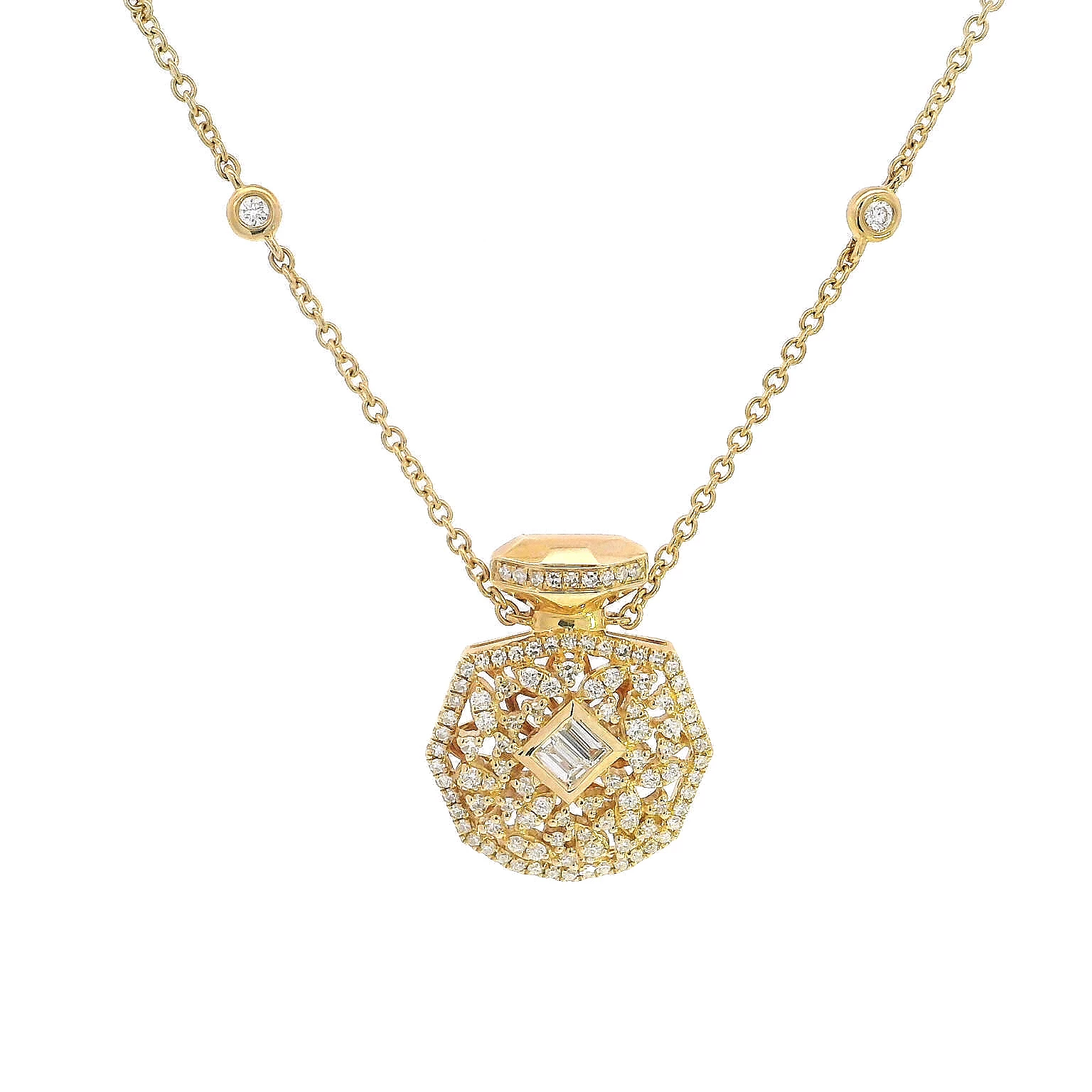 Elevate your style with this captivating pendant crafted from radiant 14K yellow gold. This exquisite piece is crafted in the shape of a perfume bottle studded with round cut diamonds exuding timeless... Read More