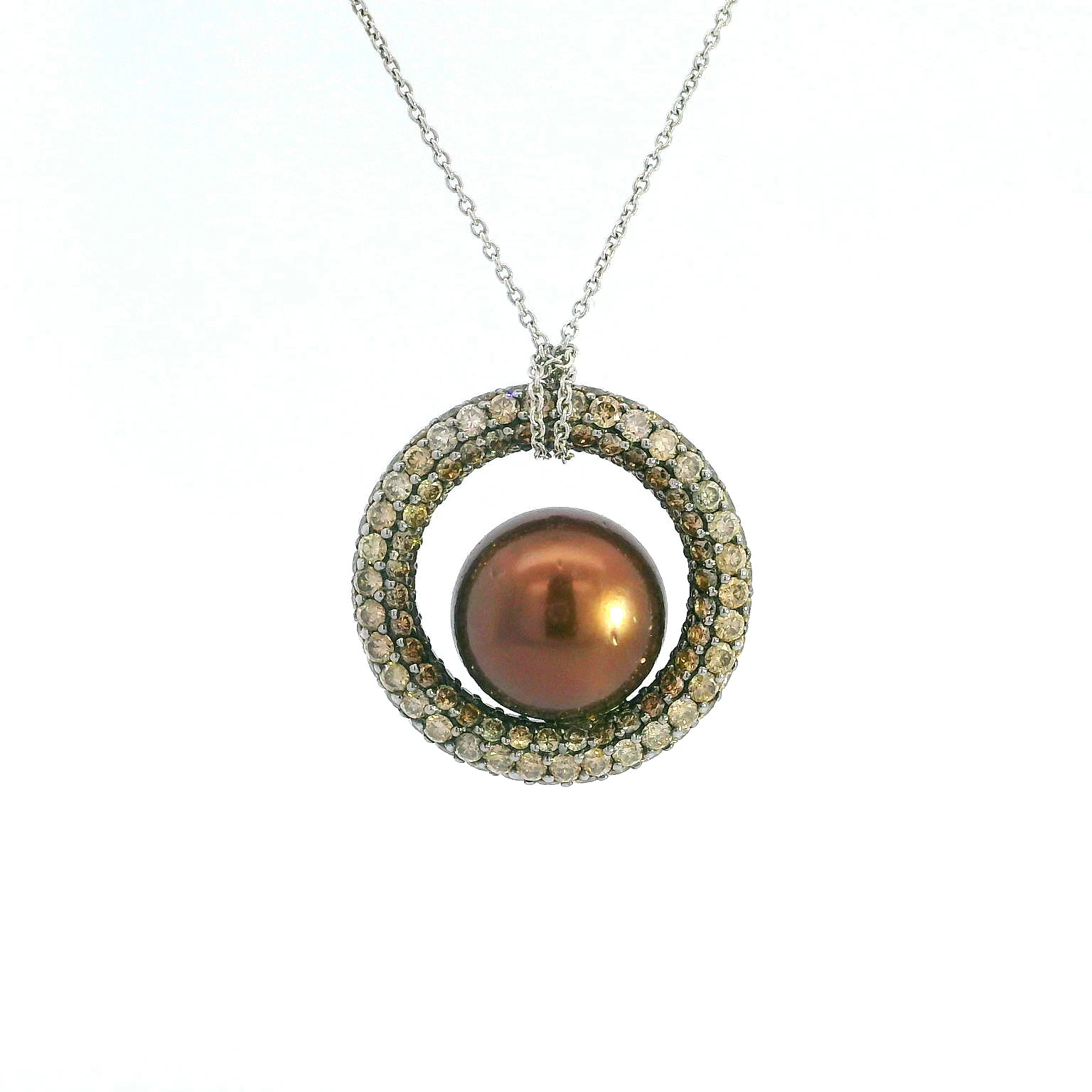 Elevate your elegance with this exquisite pendant showcasing a stunning "chocolate" pearl. The sparkle of the chocolate diamonds enhance the pearl's luster altogether creating a graceful and timeless ...