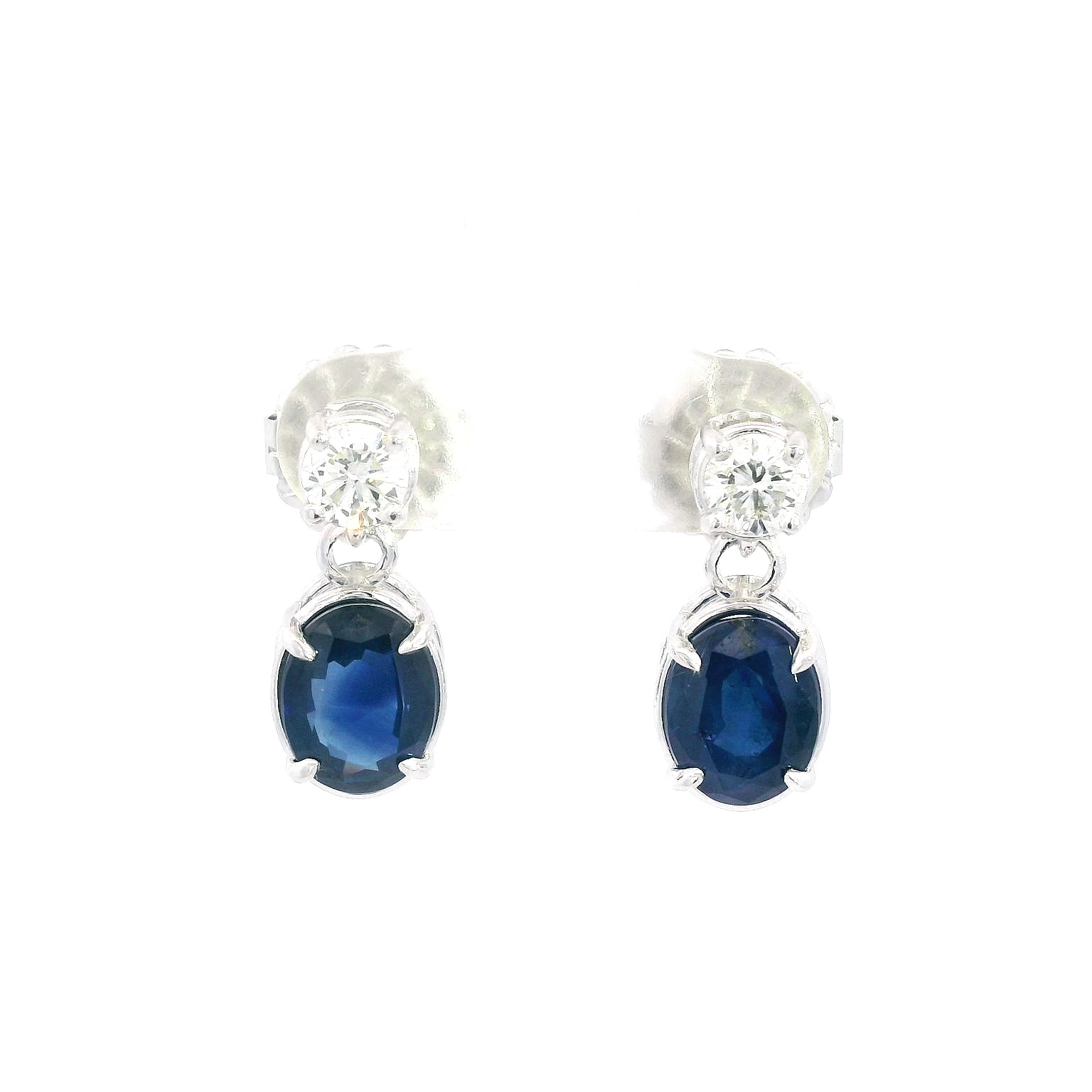 Adorn your ears with these elegant drop earrings featuring deep blue sapphires set beneath brilliant round diamonds. This design showcases 18K white gold forming a graceful and timeless piece. These e...