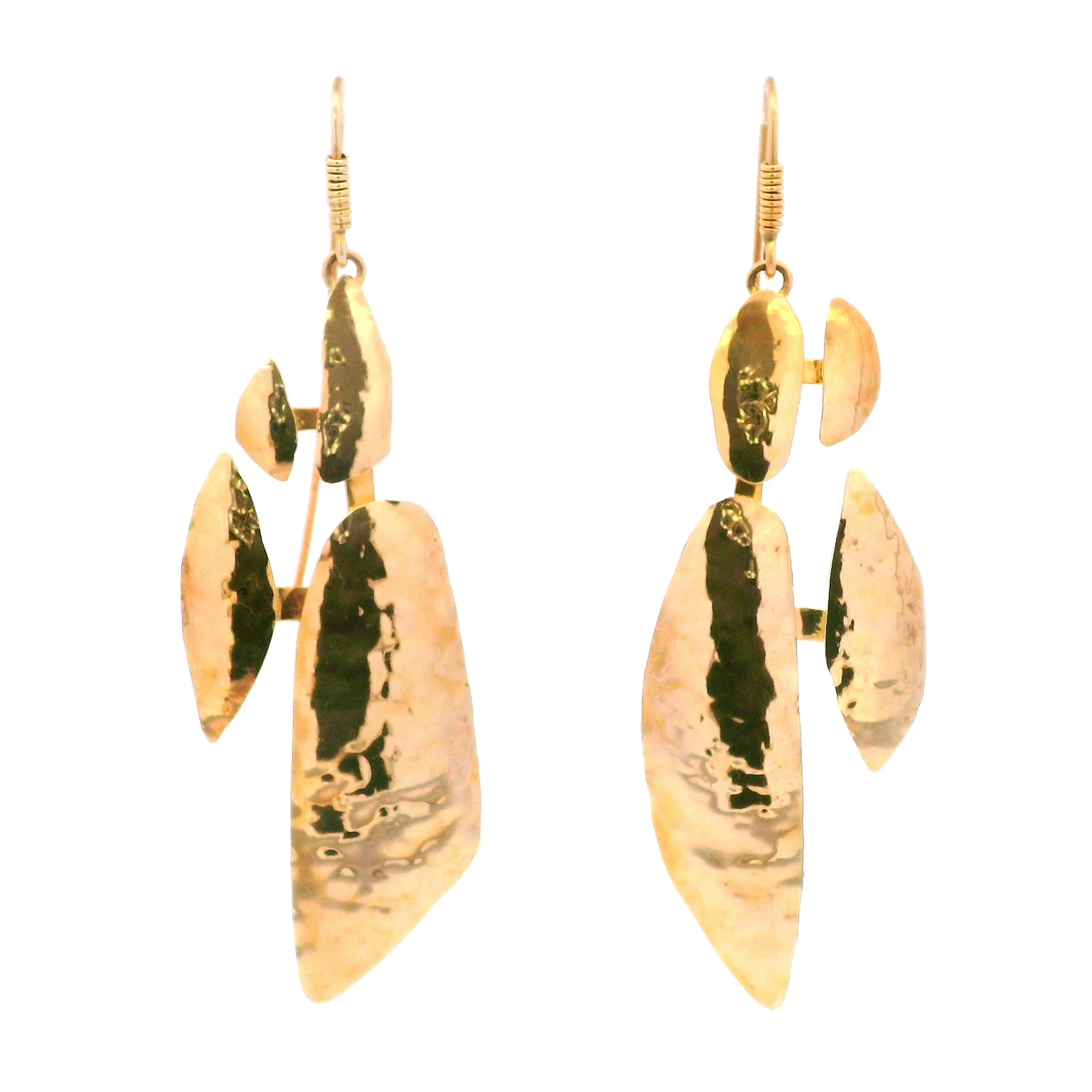 Elevate your style with these captivating 14K yellow gold dangle earrings. The hammered texture adds depth and dimension, while the abstract geometric shapes create a modern, artistic look. These stat...