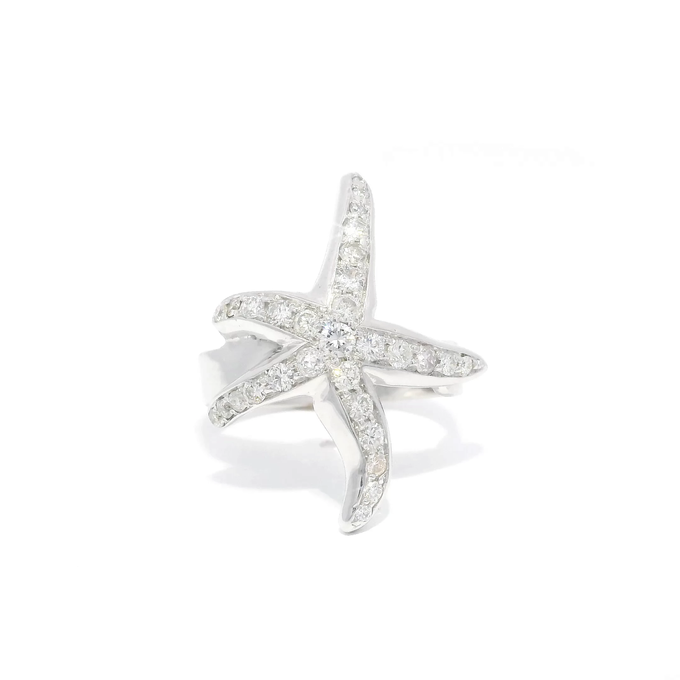 This exotic starfish ring was crafted in 18K white gold by master designer William Boyajian. The starfish motif is embellished with multiple round brilliant cut diamonds set in a micro pave style enha...