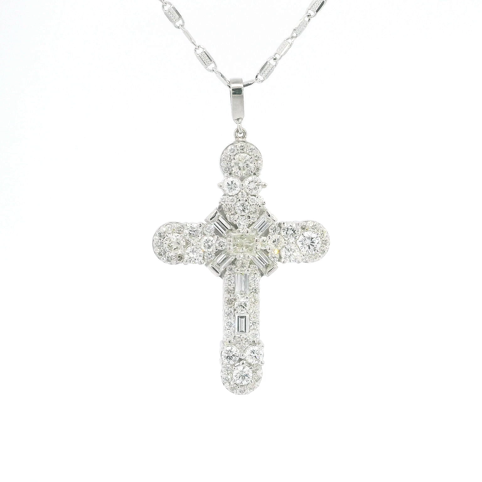 Elevate your style with this majestic diamond cross pendant crafted in lustrous 18K white gold. This pendant showcases an array of diamonds of different cuts arranged in a timeless cross design. This ...