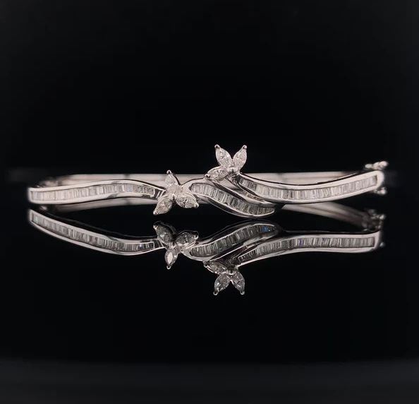 This exceptional marquise diamond bangle is crafted in 18k white gold. Featuring 77 tapered diamonds totalling 0.58 carats and 6 marquise diamonds totalling 0.23 carats this is one stunning bangle. Pe...  Read More