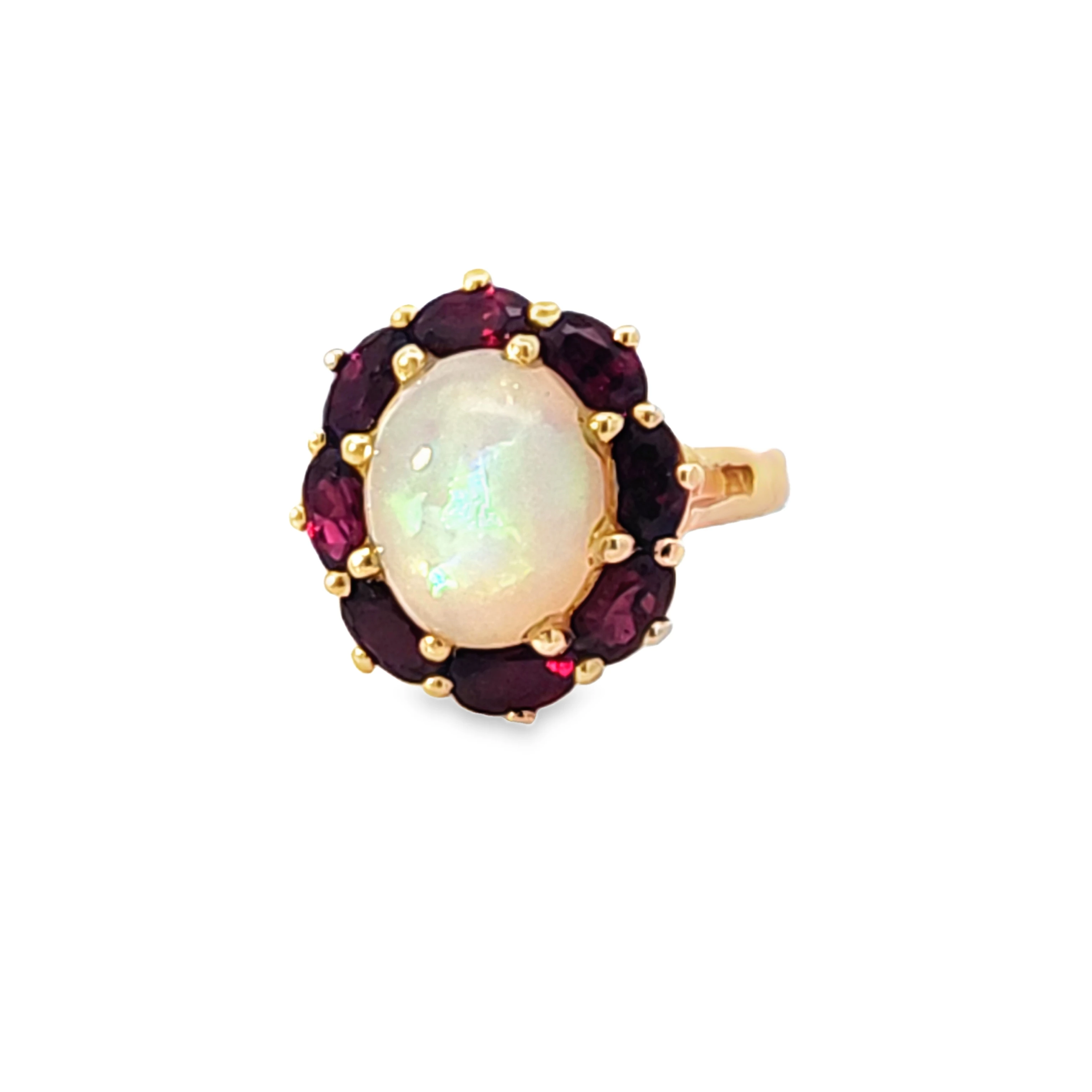 This exquisite yellow gold cocktail ring features a stunning oval cabochon opal as its centerpiece. The gemstone displays a vibrant play-of-color, showcasing iridescent flashes against a milky translu... Read More
