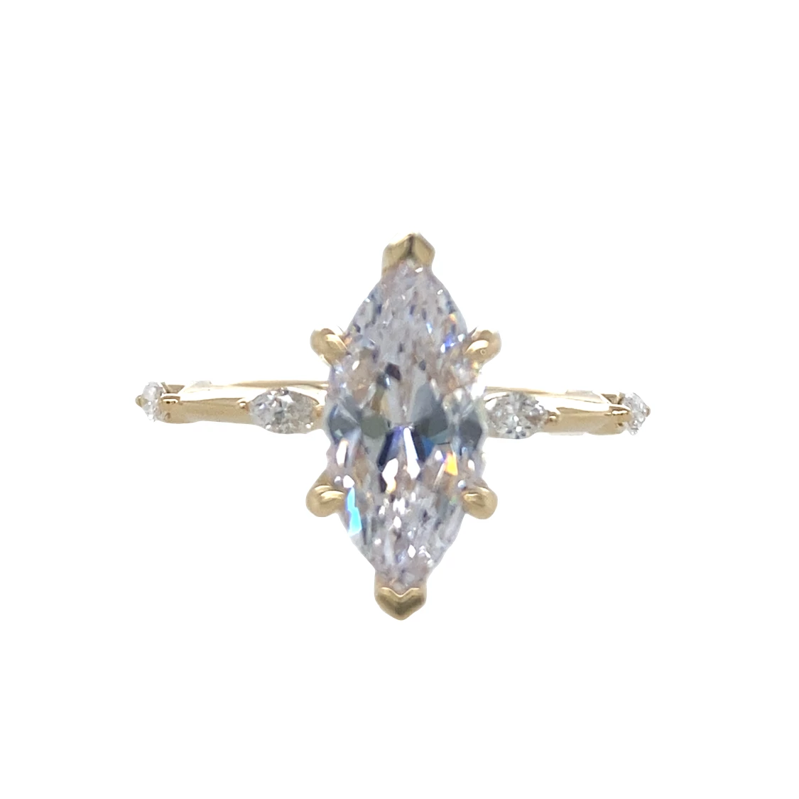 This stunning marquise cut diamond ring is a true statement piece. Set in a delicate gold band, the central diamond sparkles brilliantly, flanked by smaller diamonds that enhance its elegance. Perfect...