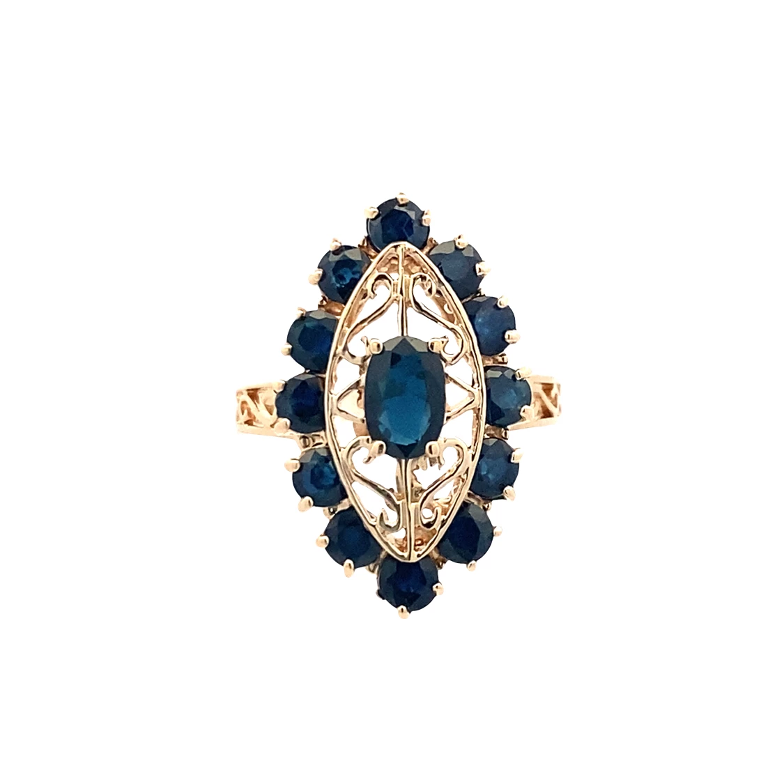 Exquisite multistone ring crafted in yellow gold, showcasing an oval cabochon cut sapphire at its center. The intricate design is further adorned with a halo of round cut sapphires, creating a strikin... Read More